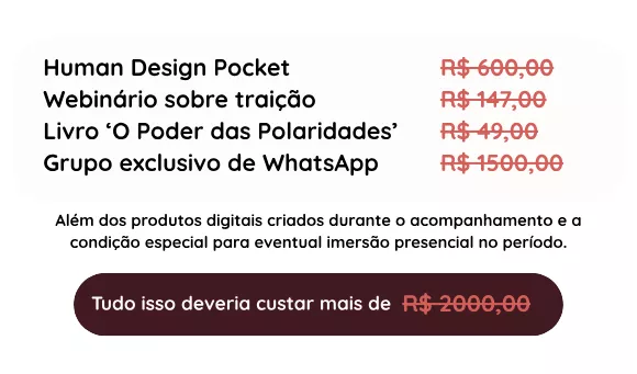 Você também conta com o acesso aos produtos digitais criados durante o acompanhamento e condição especial para eventual imersão presencial no período.